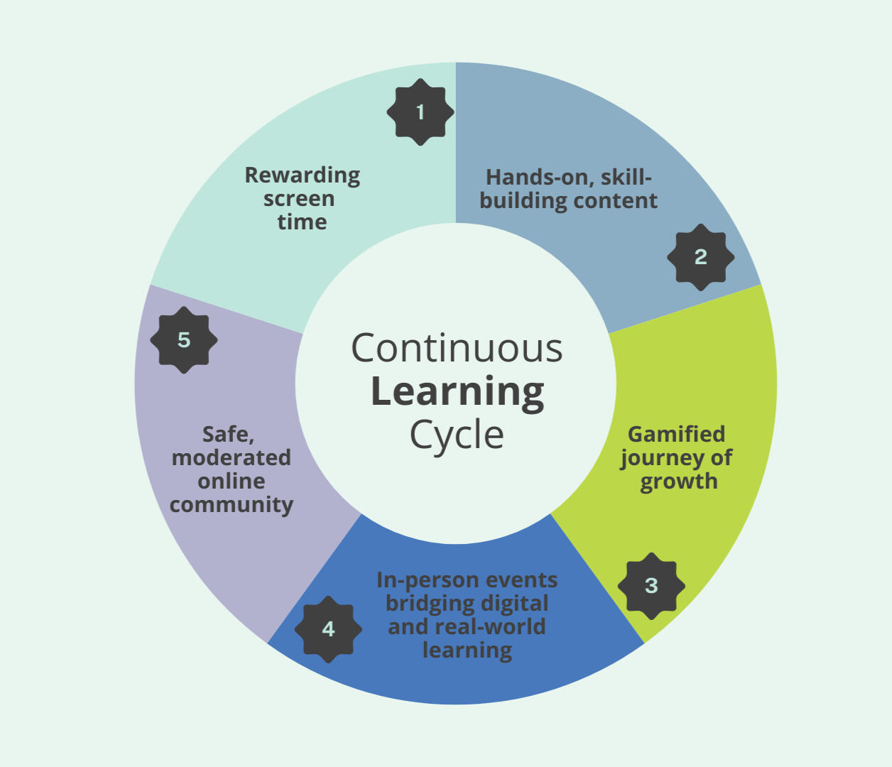 Children move through a continuous learning cycle where curiosity leads to creation, creation leads to sharing, and sharing fuels confidence. Each step builds naturally on the last, helping kids stay engaged while seeing clear progress over time.The experience is designed to feel motivating and empowering — giving children a sense of ownership over their learning and pride in what they create.